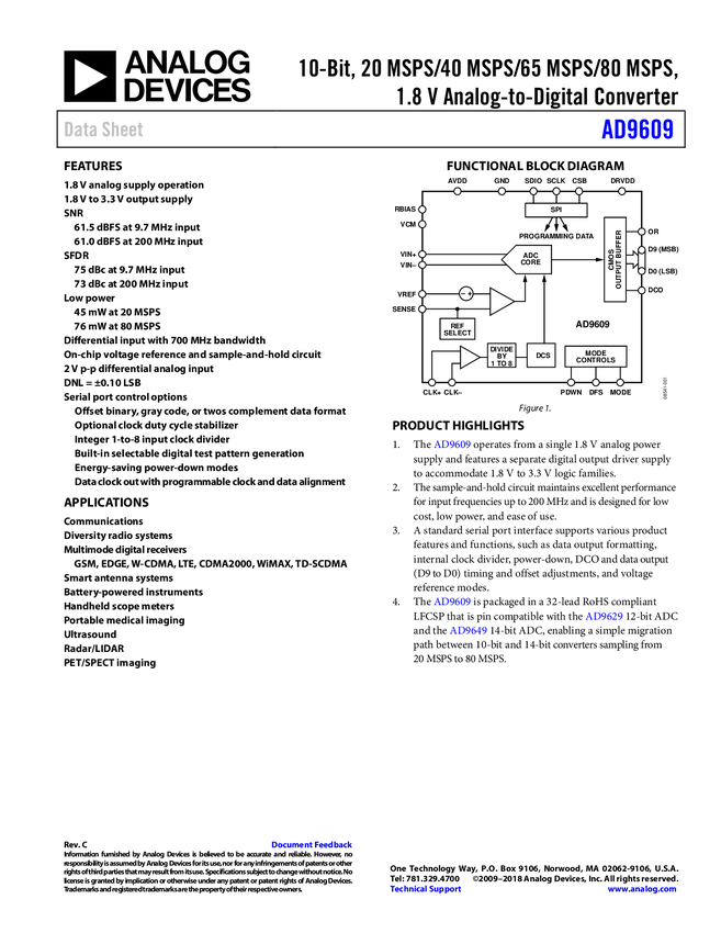 AD9609 10-Bit, 20 MSPS/40 MSPS/65 MSPS/80 MSPS, 1.8 V Analog-to-Digital Converter