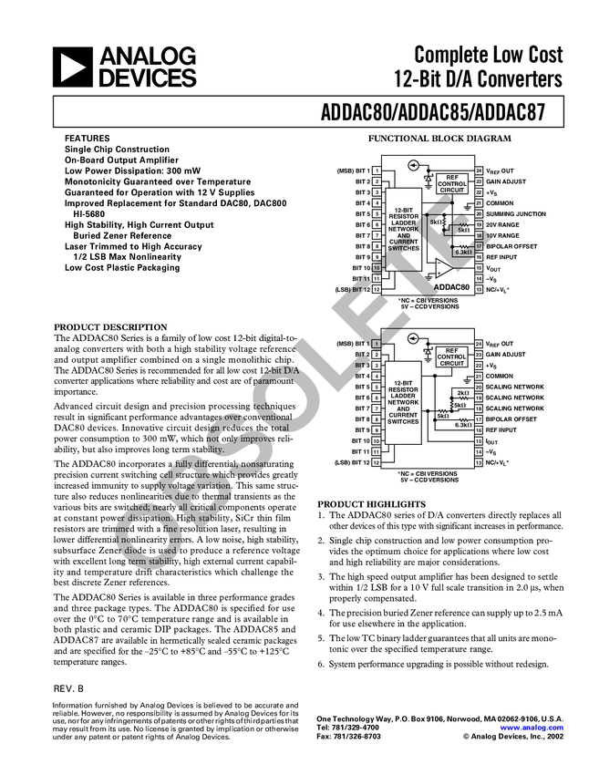 ADDAC80 Complete Low Cost Hybrid 12-Bit D/A Converter, -25 to +85°C