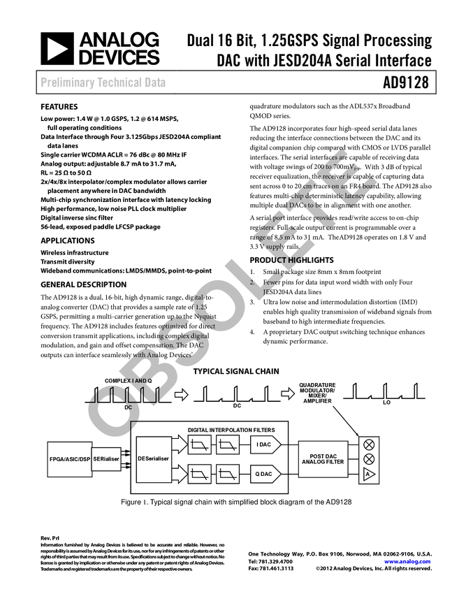 AD9128 Dual 16 Bit, 1.25GSPS Signal Processing DAC with JESD204A Serial Interface