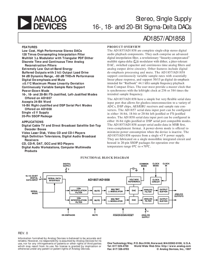 AD1858 Stereo, Single Supply 16-, 18- and 20-Bit Sigma-Delta DACs