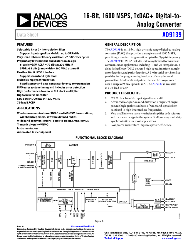 AD9139 16-Bit, 1600 MSPS, TDAC+ Digital-to-Analog Converter