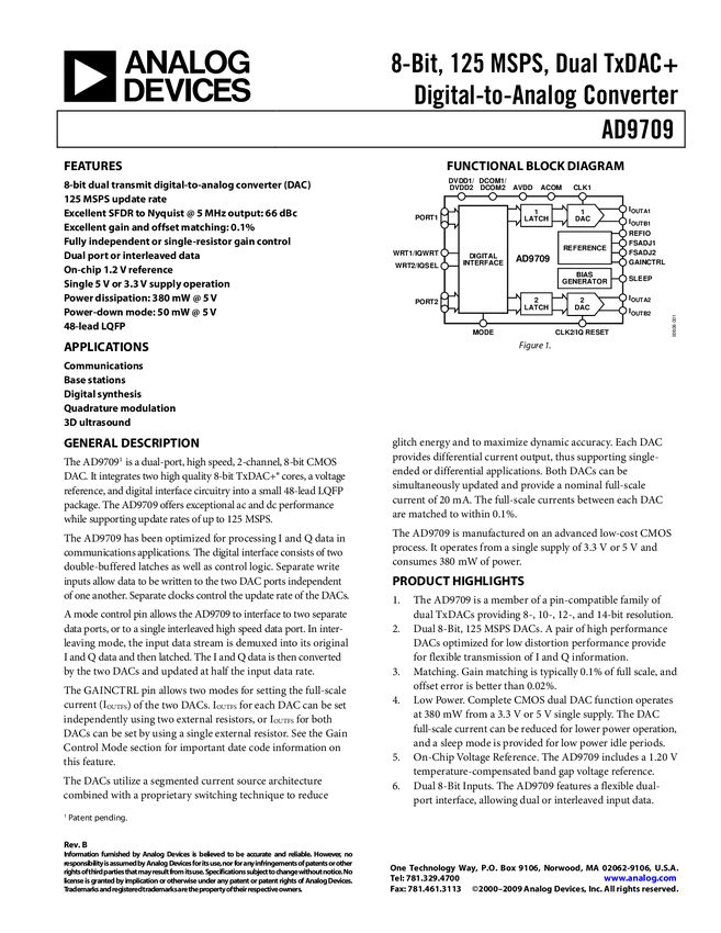 AD9709 8-Bit, 125 MSPS Dual TxDAC+ Digital-to-Analog Converter