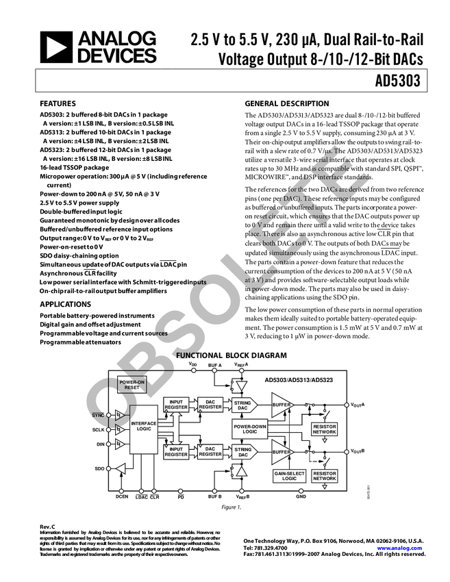 AD5303 2.5 V to 5.5 V, 230 µA, Dual Rail-to-Rail Voltage Output 8-Bit DACs