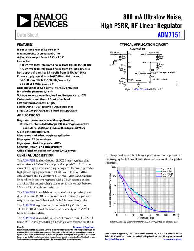 ADM7151 800 mA Ultralow Noise, High PSRR, RF Linear Regulator