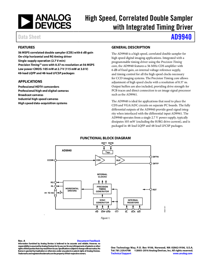AD9940 High Speed, Correlated Double Sampler with Integrated Timing Driver