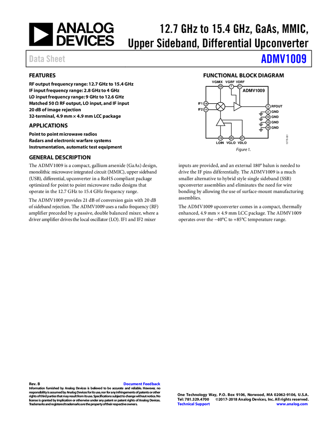 ADMV1009 12.7 GHz to 15.4 GHz, GaAs, MMIC, Upper Sideband, Differential Upconverter