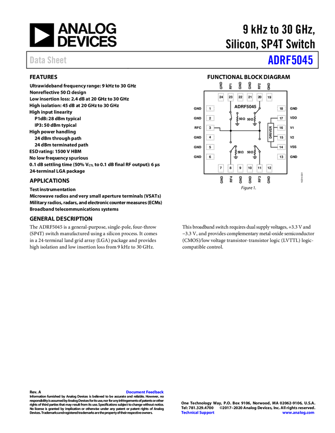 ADRF5045 9 kHz to 30 GHz, Silicon, SP4T Switch