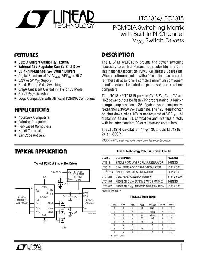 LTC1314 PCMCIA Switching Matrix with Built-In N-Channel VSwitch Drivers