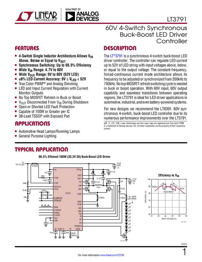 LT3791 60V 4-Switch Synchronous Buck-Boost LED Driver Controller
