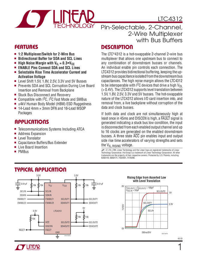 LTC4312 Pin-Selectable, 2-Channel, 2-Wire Multiplexer with Bus Buffers
