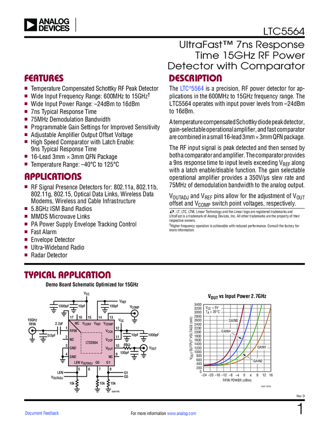 LTC5564 UltraFast 7ns Response Time 15GHz RF Power Detector with Comparator