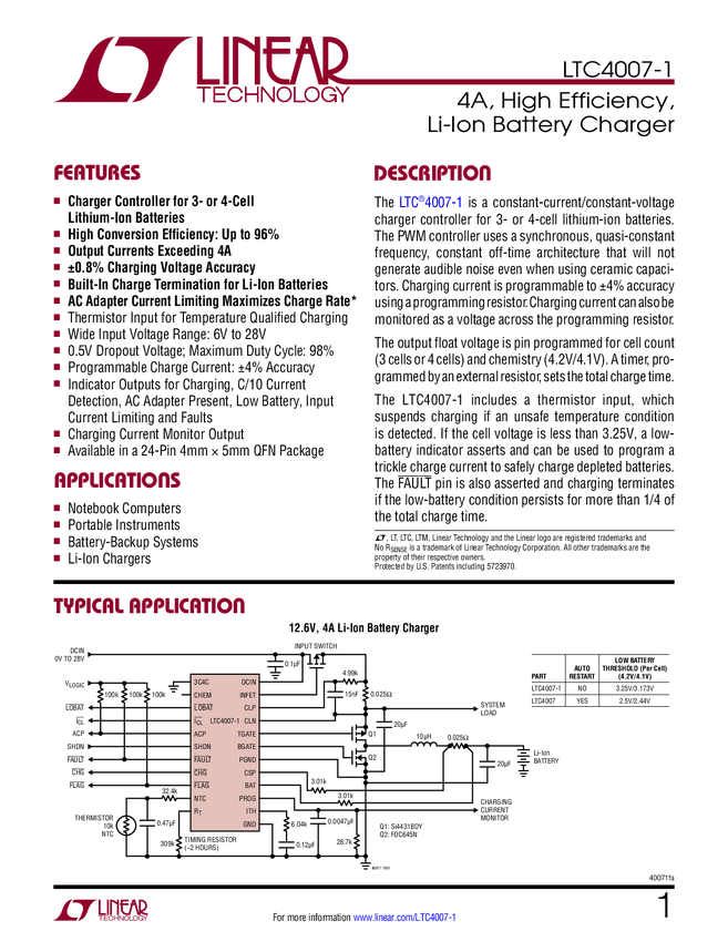 LTC4007-1 4A, High Efficiency, Li-Ion Battery Charger