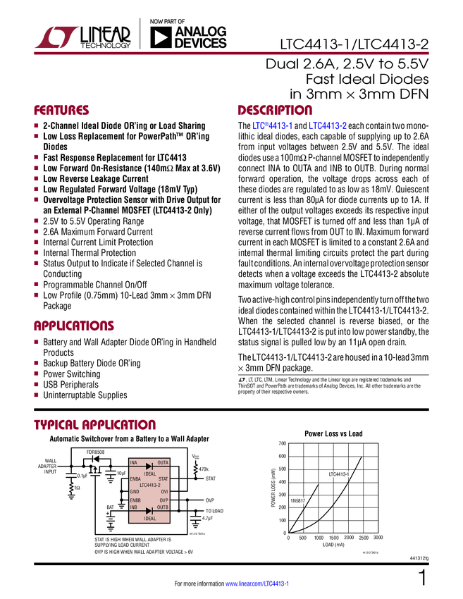 LTC4413-1 LTC4413-2 Dual 2.6A, 2.5V to 5.5V Fast Ideal Diodes in a 3mm × 3mm DFN