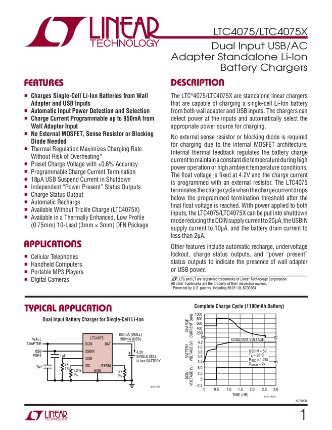 LTC4075 LTC4075X Dual Input USB/AC Adapter Standalone Li-Ion Battery Chargers