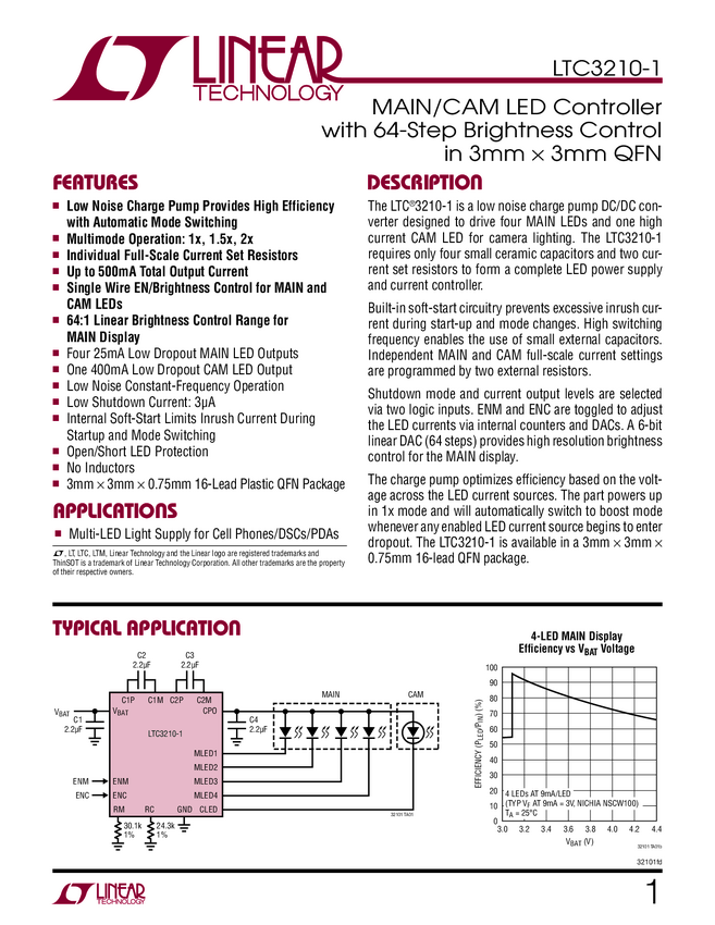 LTC3210-1 MAIN/CAM LED Controller with 64-Step Brightness Control in 3mm × 3mm QFN