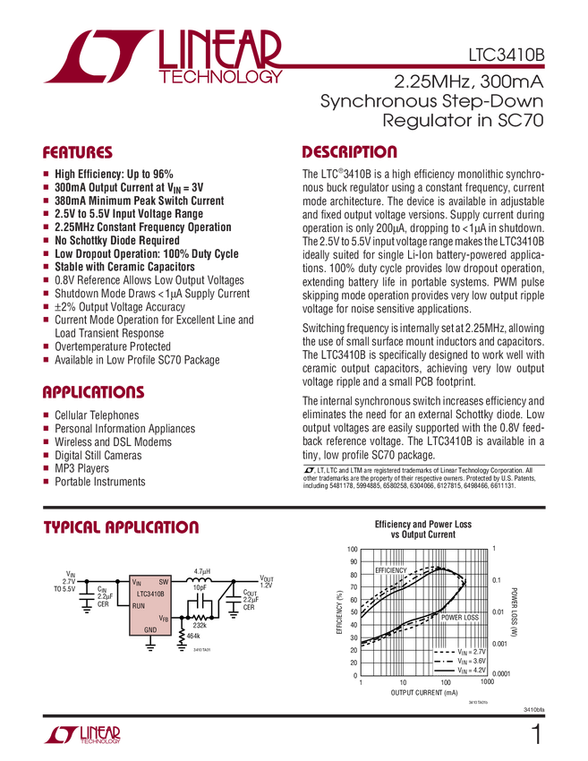 LTC3410B 2.25MHz, 300mA Synchronous Step-Down Regulator in SC70