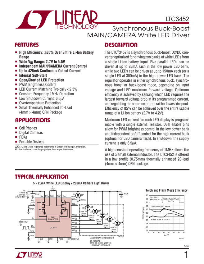 LTC3452 Synchronous Buck-Boost MAIN/CAMERA White LED Driver