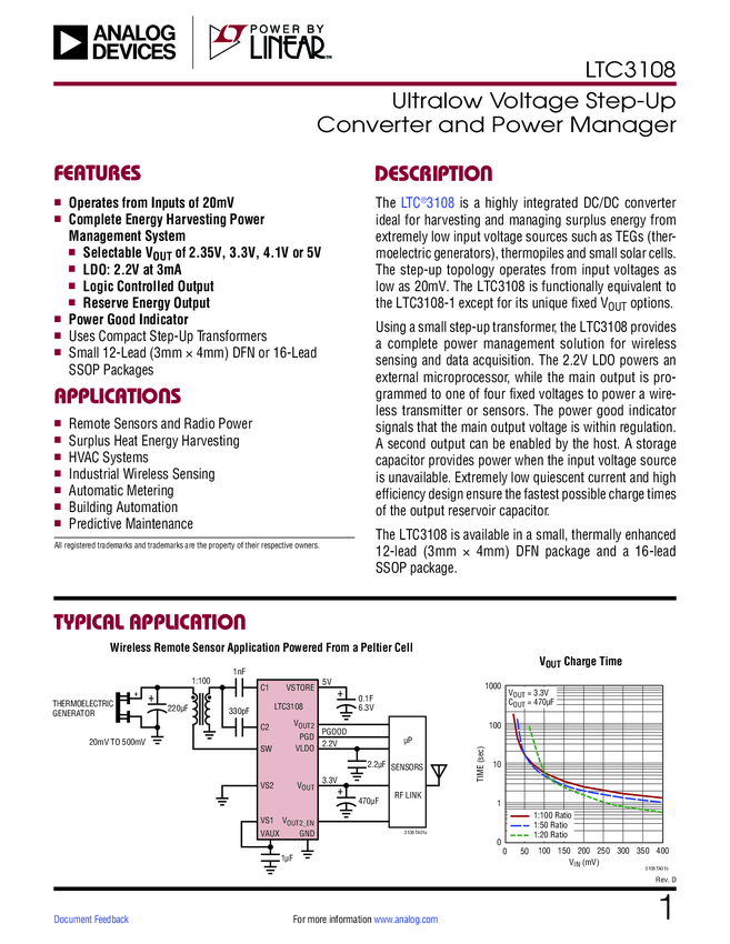 LTC3108 Ultralow Voltage Step-Up Converter and Power Manager