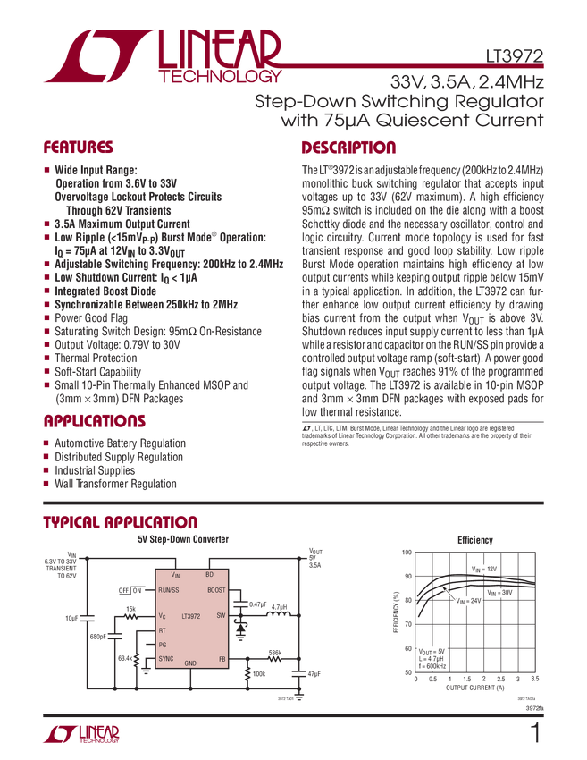 LT3972 33V, 3.5A, 2.4MHz Step-Down Switching Regulator with 75μA Quiescent Current