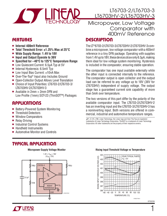 LT6703 Micropower, Low Voltage Comparator with 400mV Reference