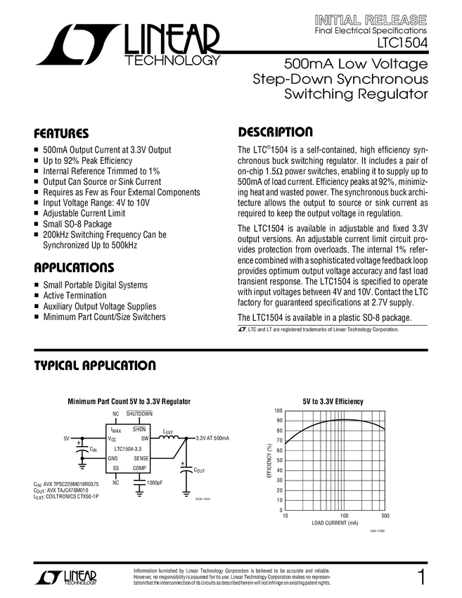 LTC1504 500mA Low Voltage Step-Down Synchronous Switching Regulator