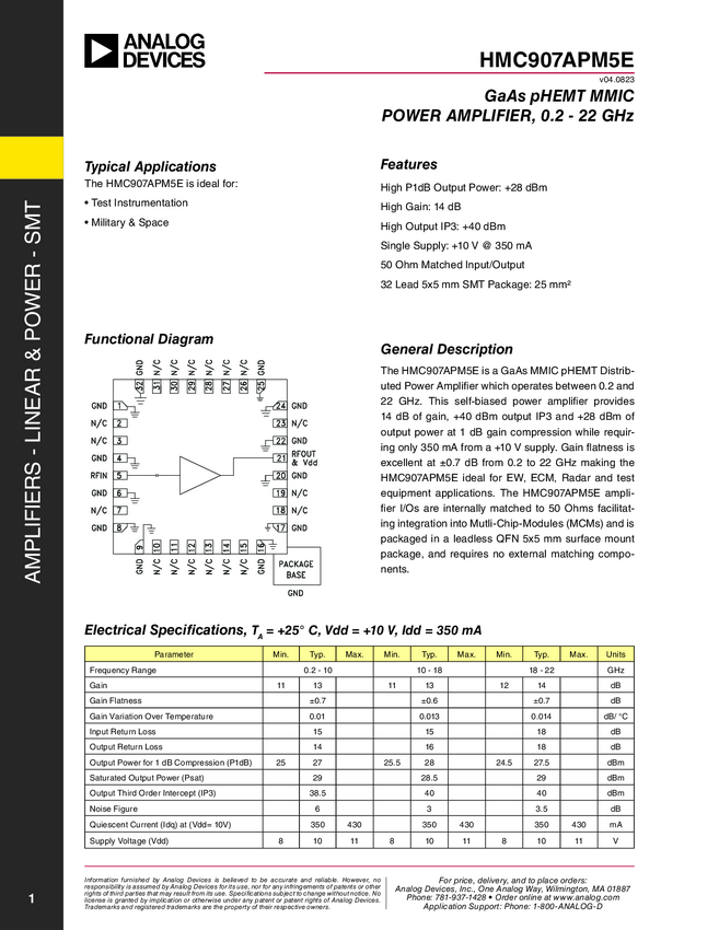 HMC907APM5E GaAs pHEMT MMIC Power Amplifier 0.2 - 22 GHz