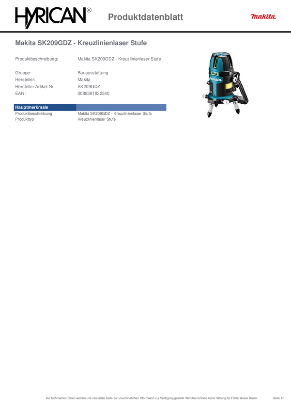 SK209GDZ Laser wieloliniowy Makita S_0380_5491093 SK209GDZ Maksymalny zasięg: 10 m