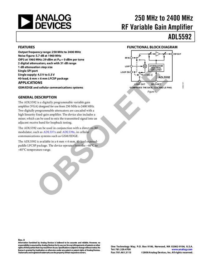 ADL5592 250 MH to 2400 MH RF Variable Gain Amplifier