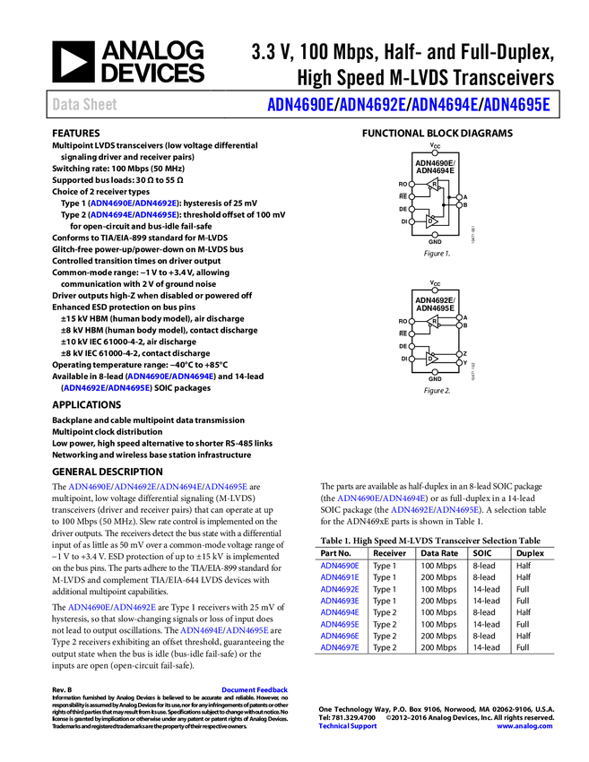 ADN4692E 3.3 V, 100 Mbps, Half-Duplex, High Speed M-LVDS Transceiver with Type 1 Rec...