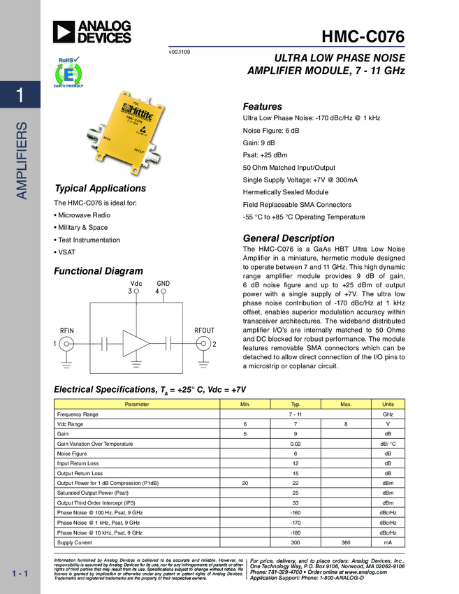 HMC-C076 Ultra Low Phase Noise Amplifier Module, 7 - 11 GHz