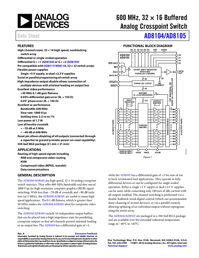 AD8104 600 MH, 32 × 16 Buffered Analog Crosspoint Switch