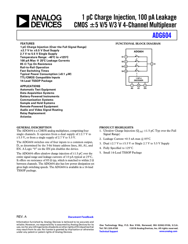 ADG604 1 pC Charge Injection, 100 pA Leakage CMOS ±5 V/5 V/3 V 4-Channel Multiplex...