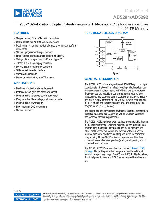 AD5292 256-/1024-Position, Digital Potentiometers with Maximum ±1% R-Tolerance Err...