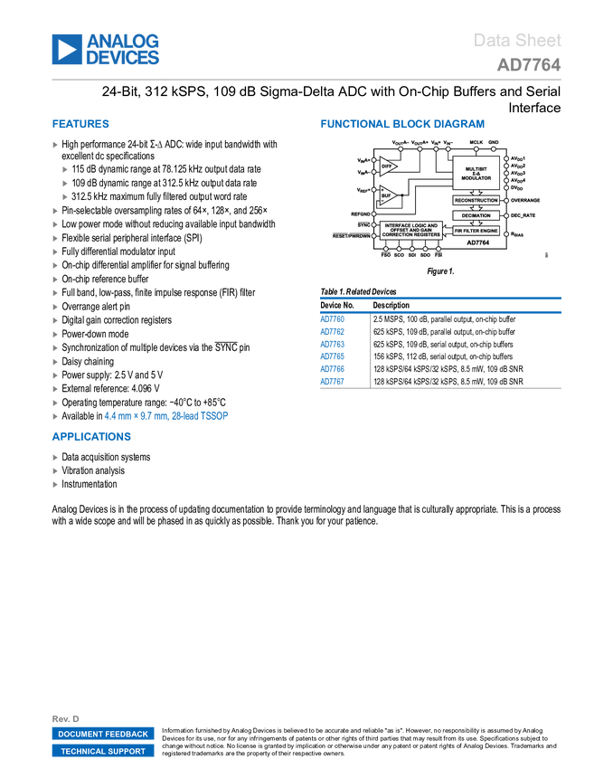 AD7764 24-Bit, 312 kSPS, 109 dB Sigma-Delta ADC with On-Chip Buffers and Serial In...