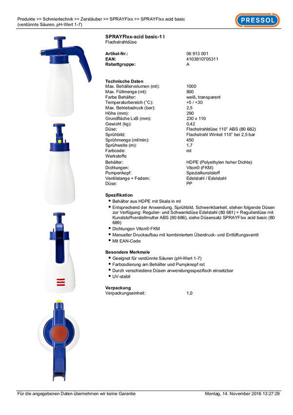 Pressol 6913001 SPRAYFIxx-acid basic-1 l Spryskiwacz przemysłowy 1 l biały, niebieski