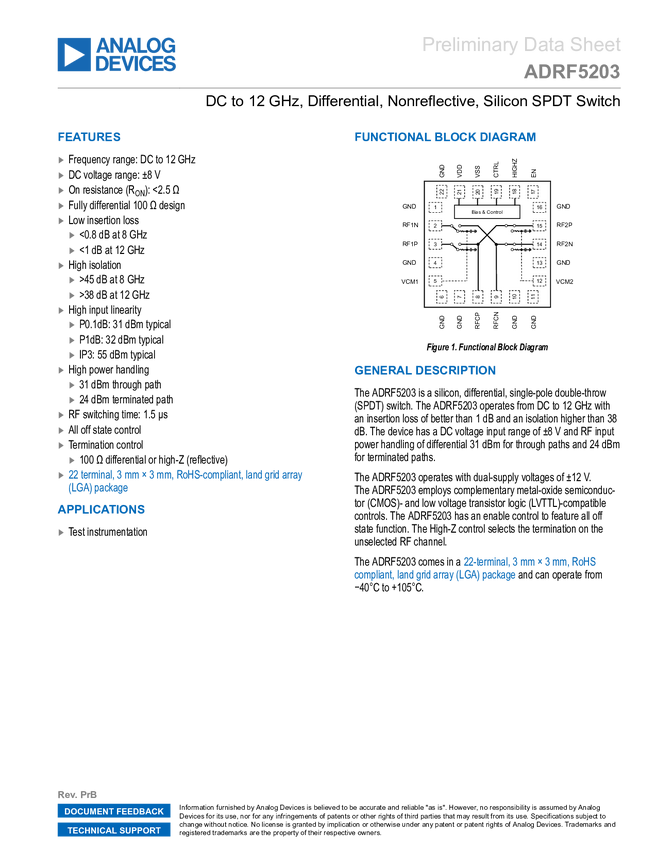 ADRF5203 DC to 12 GHz, Differential, Nonreflective, Silicon SPDT Switch