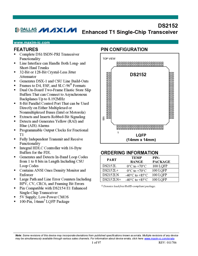 DS2152 Enhanced T1 Single Chip Transceiver
