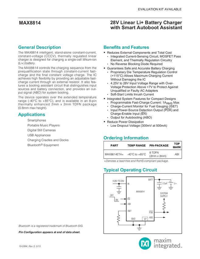 MAX8814 28V Linear Li+ Battery Charger with Smart Autoboot Assistant