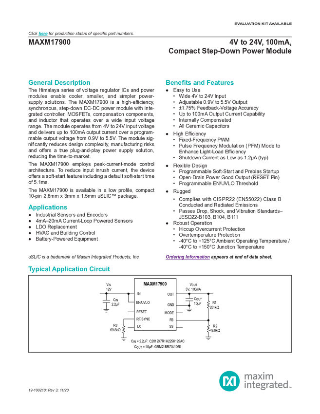 MAXM17900 4V to 24V, 100mA, Compact Step-Down Power Module