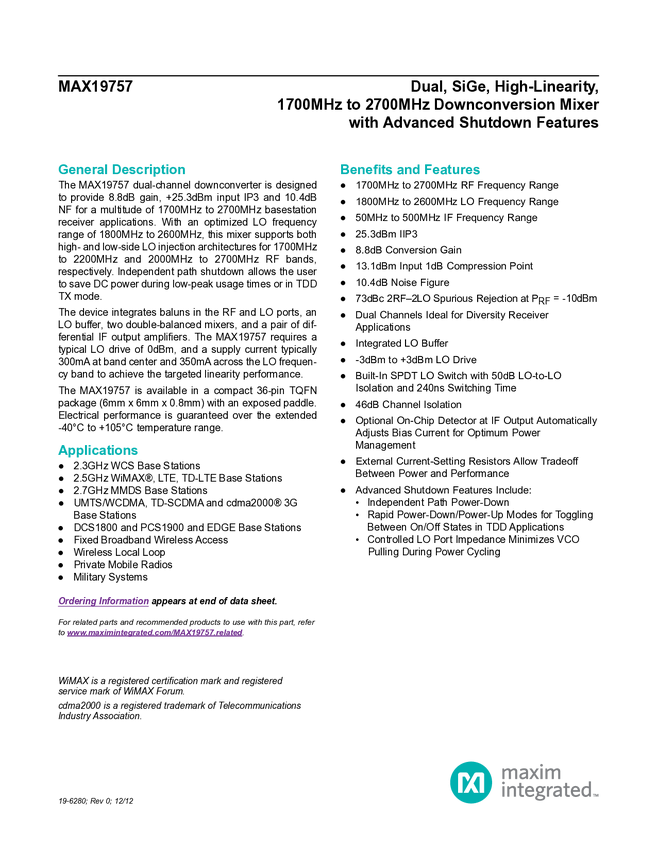 MAX19757 Dual, SiGe, High-Linearity, 1700MHz to 2700MHz Downconversion Mixer with Ad...