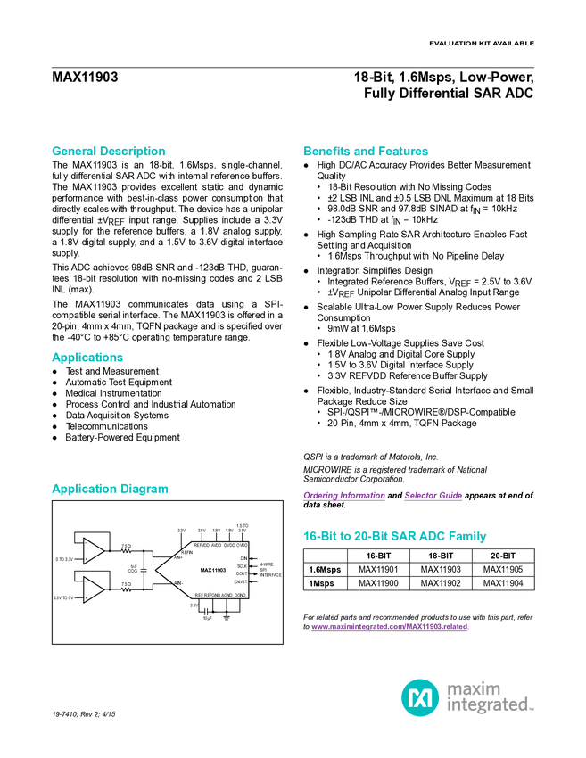 MAX11903 18-Bit, 1.6Msps, Low-Power, Fully Differential SAR ADC