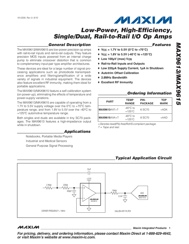 MAX9613 Low-Power, High-Efficiency, Single/Dual, Rail-to-Rail I/O Op Amps