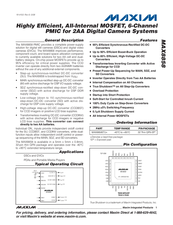 MAX8858 Smallest, All-Internal MOSFET, 6-Channel DSC PMIC in a 5mm x 5mm TQFN