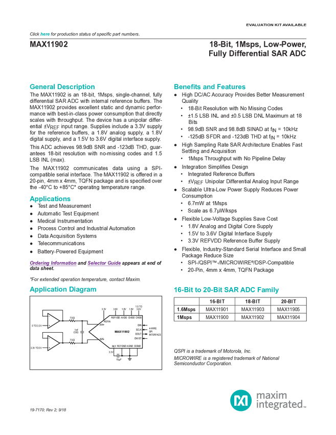 MAX11902 18-Bit, 1Msps, Low-Power, Fully Differential SAR ADC
