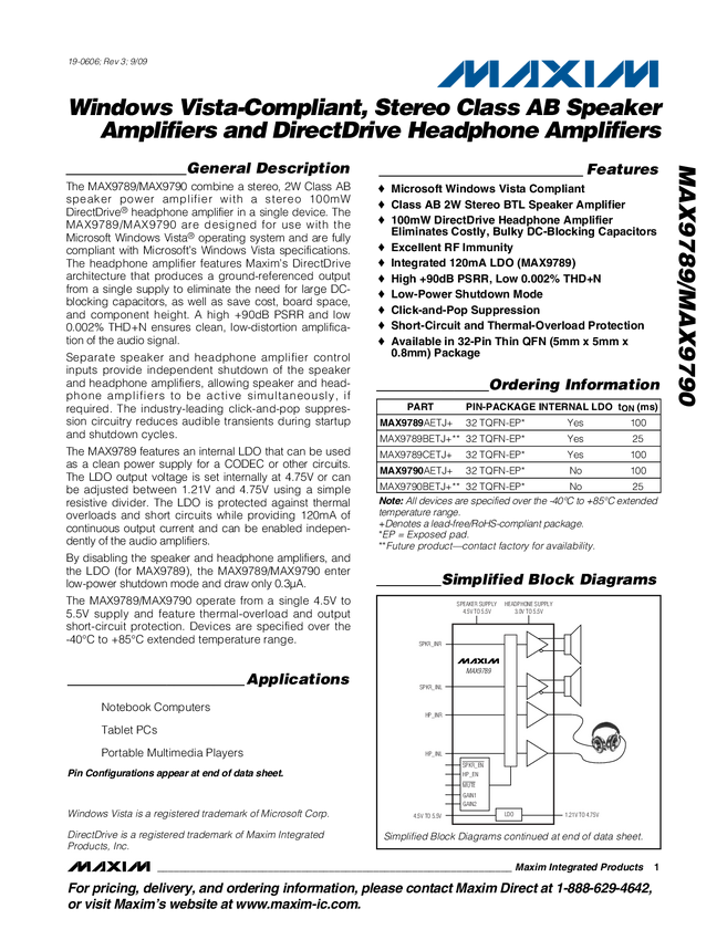 MAX9789 Windows Vista-Compliant, Stereo Class AB Speaker Amplifiers and DirectDrive...
