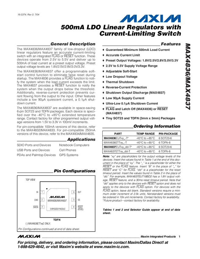 MAX4837 500mA LDO Linear Regulators with Current-Limiting Switch