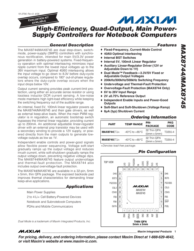 MAX8745 High-Efficiency, Quad Output, Main Power-Supply Controllers for Notebook Co...