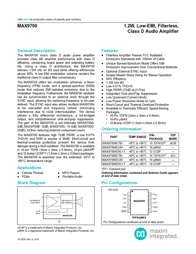 MAX9700A 1.2W, Low-EMI, Filterless, Class D Audio Amplifier