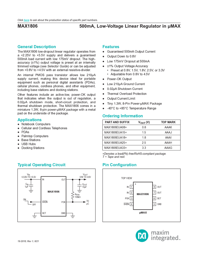 MAX1806 500mA, Low-Voltage Linear Regulator in µMAX