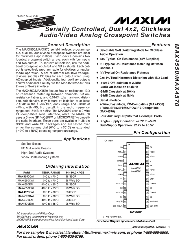 MAX4550 Serially Controlled, Dual 4x2, Clickless Audio/Video Analog Crosspoint Swit...